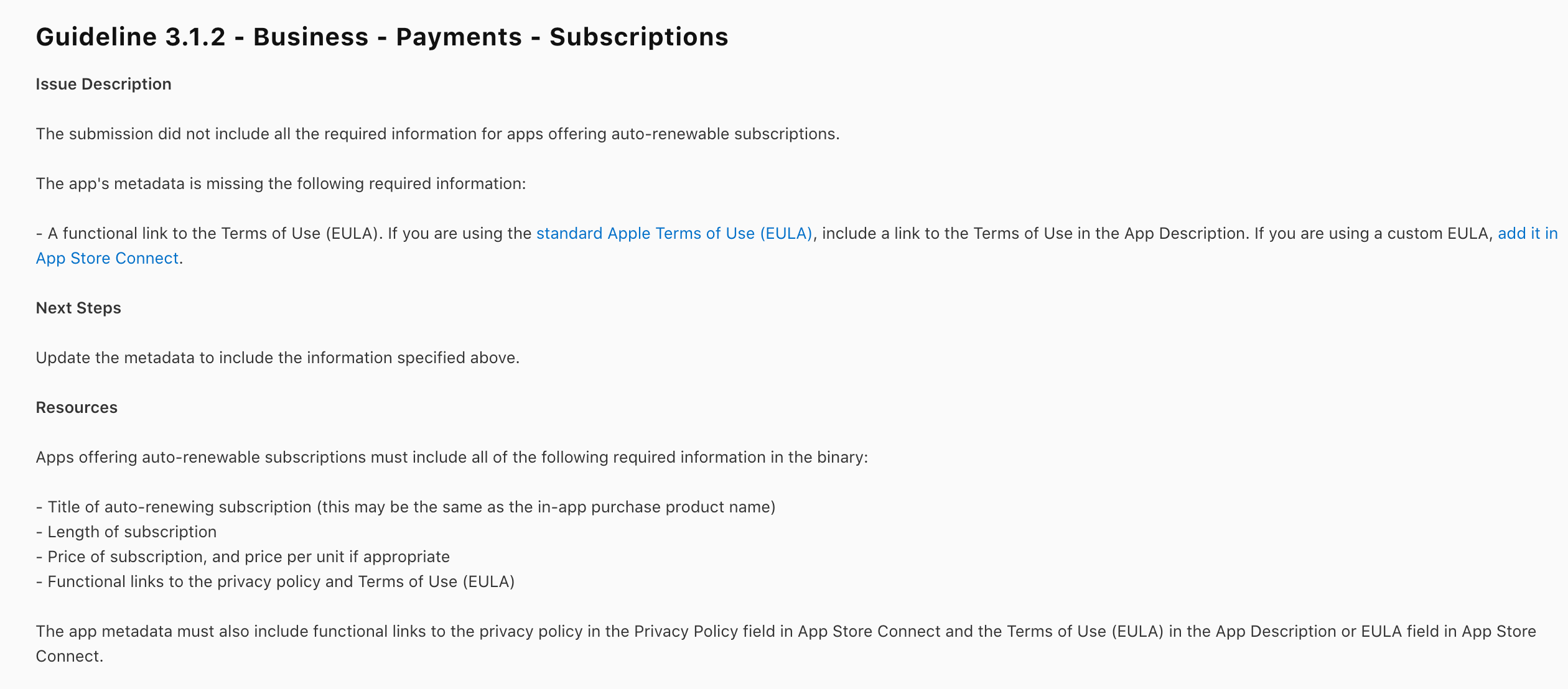 中使用自定义的使用条款,个人话建议使用苹果提供的EULA吧,然后在内购列表页面中的使用条款指向苹果提供的EULA链接即可