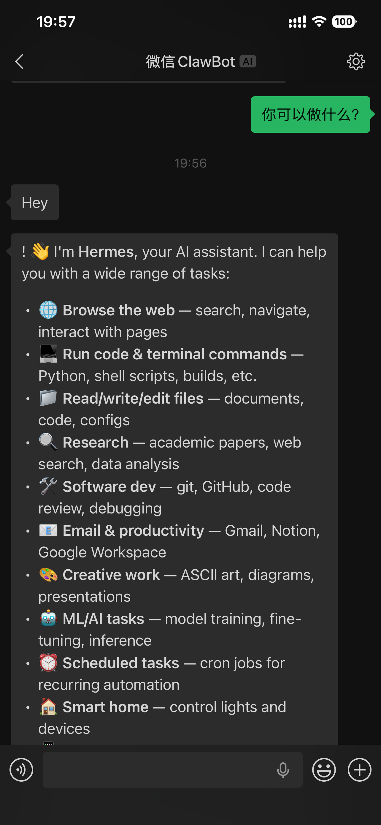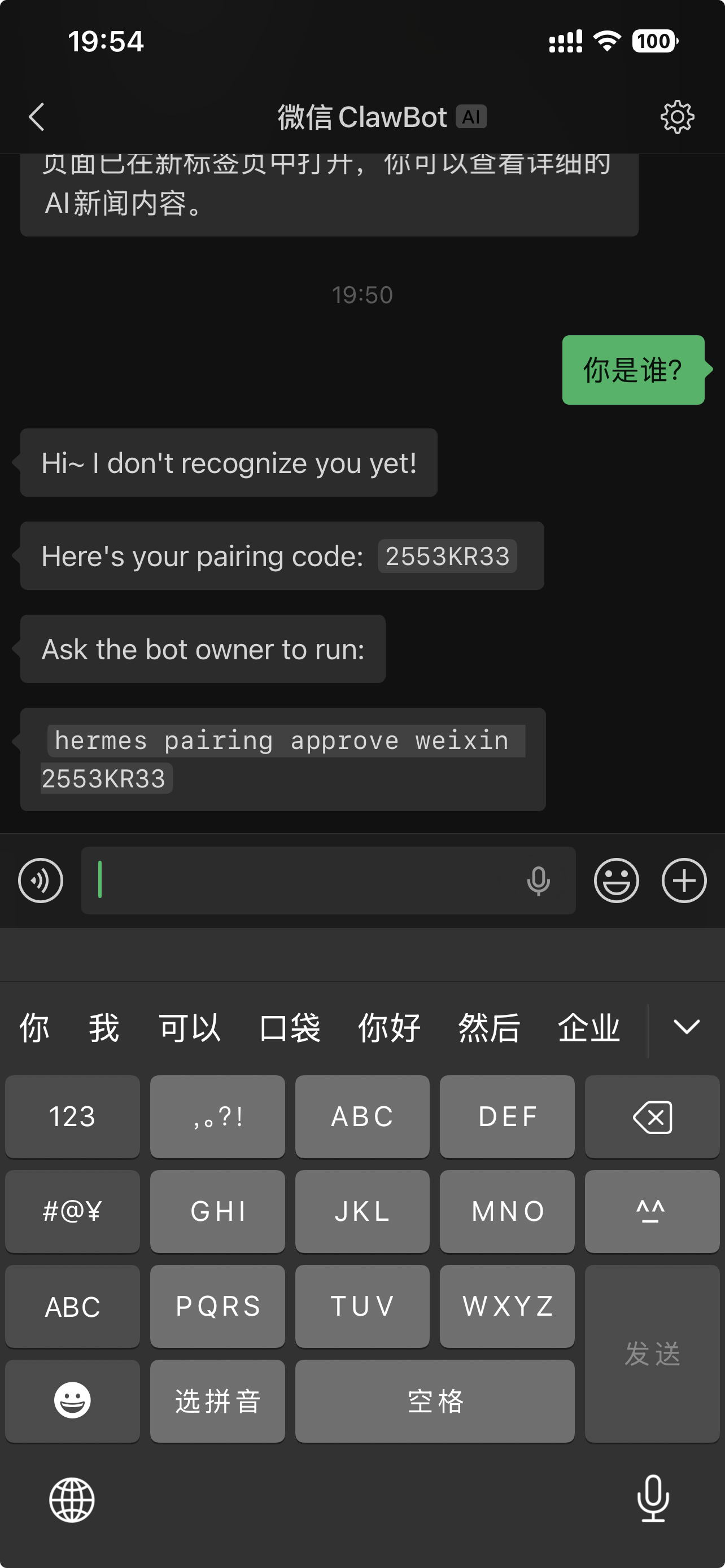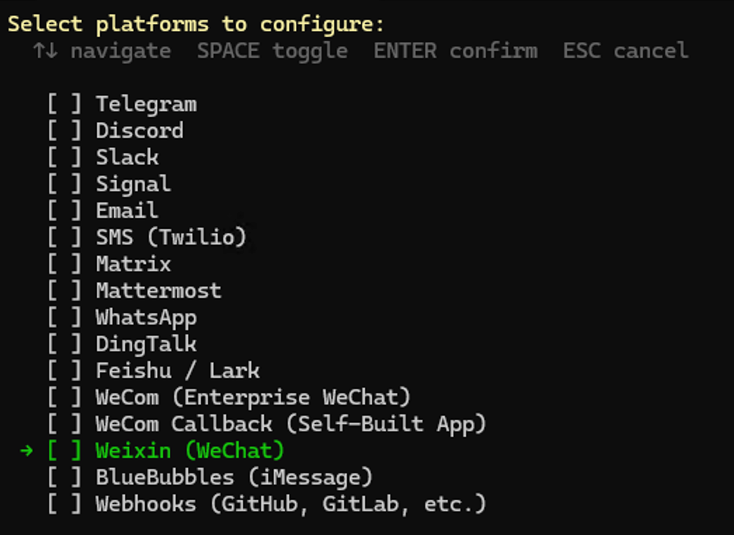 继续选择和 Hermes 的聊天工具,最新版本已经支持微信了😄