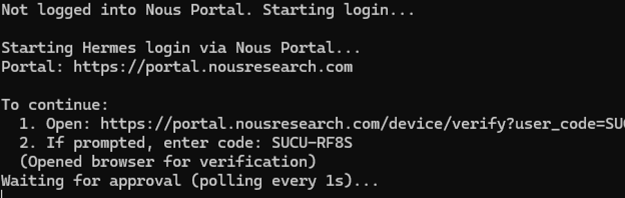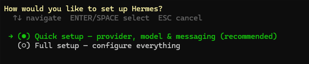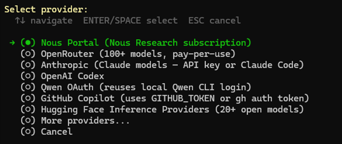 选择大模型提供商,这里选择第一个,也就是 Hermes 的开发团队,因为选择这个可以免费使用小米的 mimo-v2-pro 大模型(需要到官网注册https://portal.nousresearch.com/,且需要绑定外币卡 0刀即可)