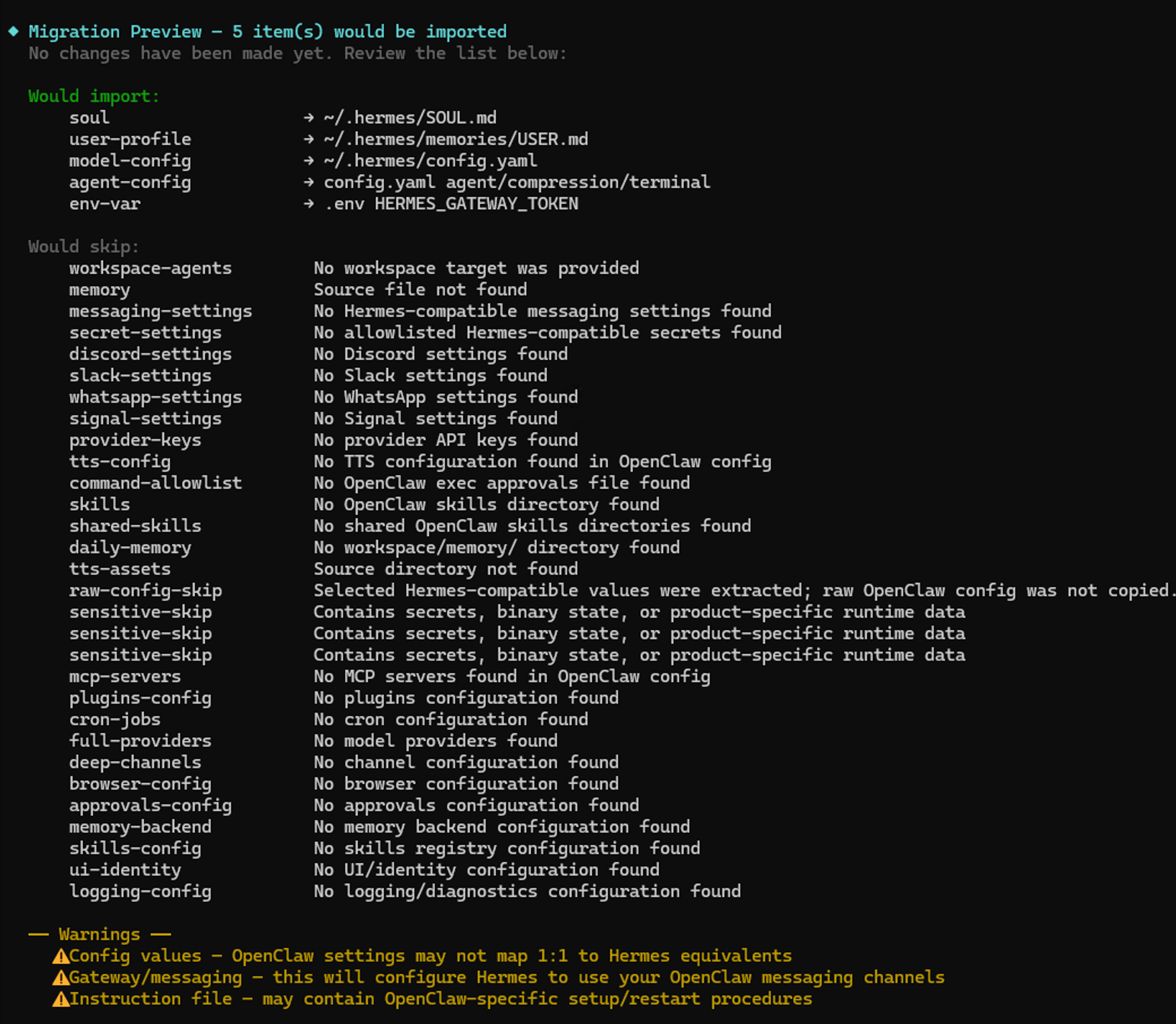 有趣的是,居然会检测到我安装的龙虾 openclaw 配置,会问你是否导入 且迁移 OpenClaw 的配置到 Harmes,选择是的话,会出现下图